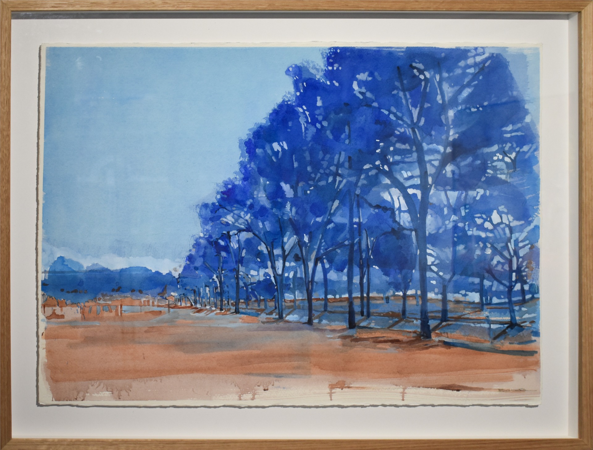 This work was created during a walk through Mitchelton Winery in Nagambie. The long row of trees caught my attention—their strong vertical forms and deep blue tones standing out against the open sky and warm earth. I wanted to capture the simplicity and structure of the scene, the way the trees framed the landscape and led the eye into the distance. The painting reflects the calm and clarity of that moment, where the geometry of nature and the quiet rhythm of the land felt balanced and beautiful.