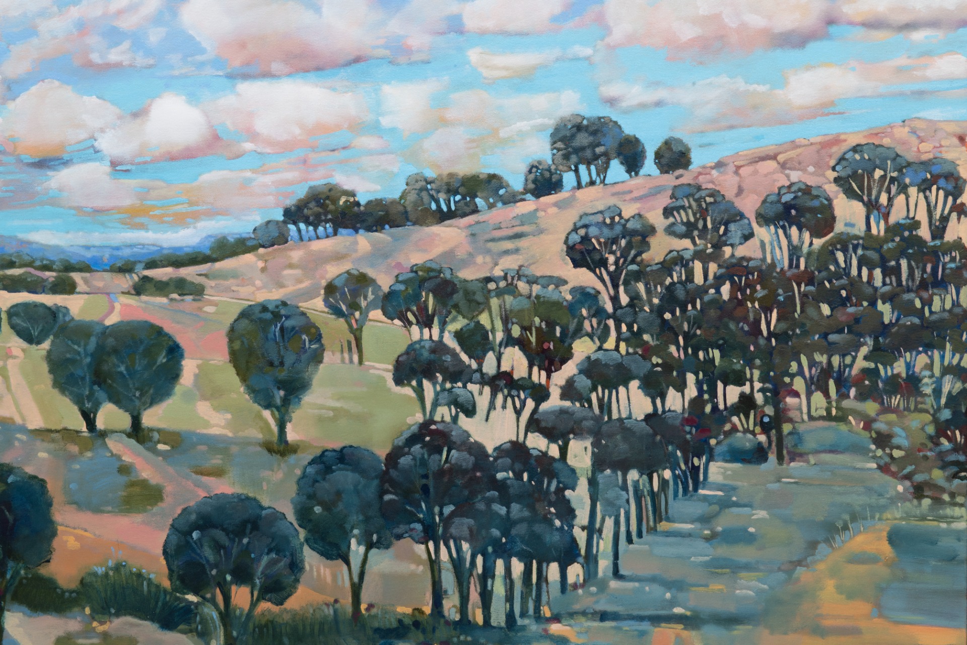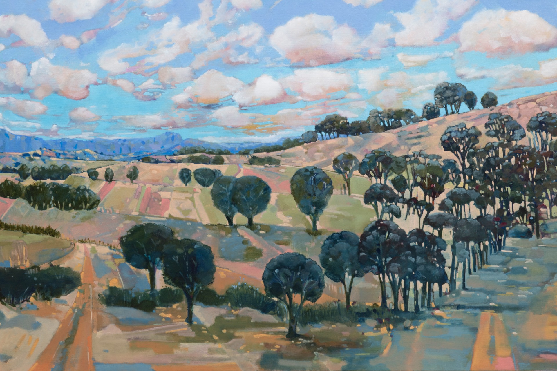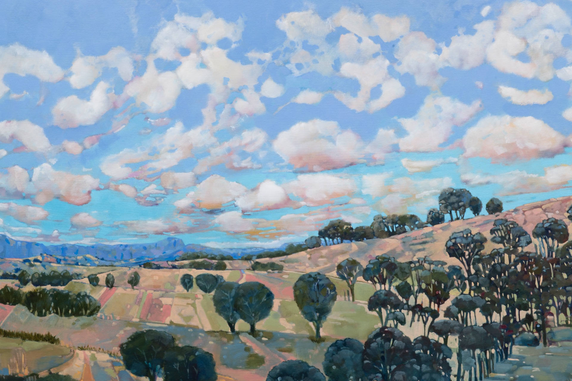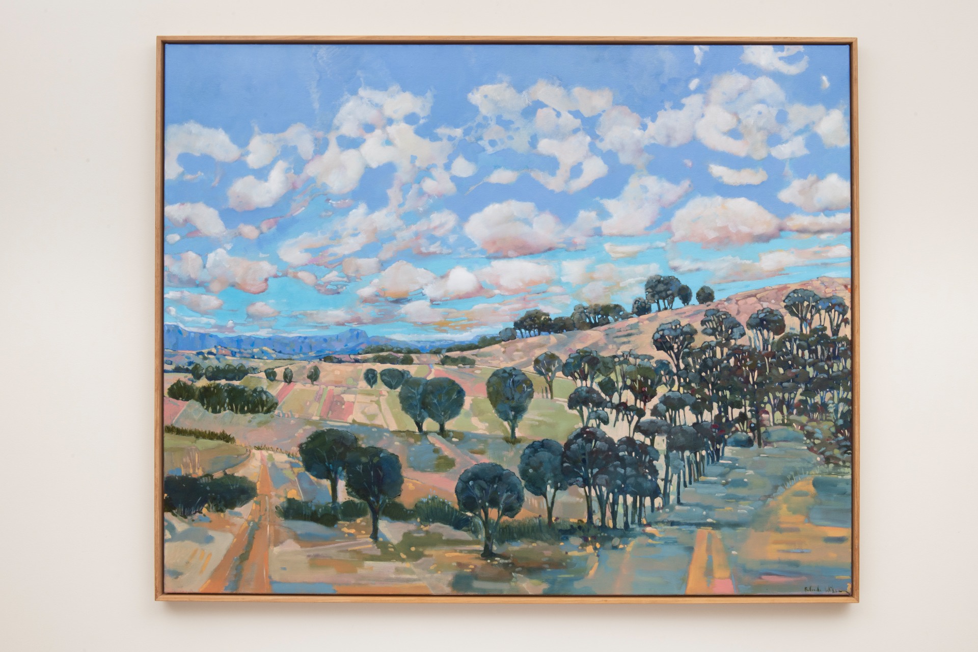Painted during a visit to the Cathedral Ranges, this work captures the peaks and valleys as they appeared in the shifting morning light. Oil on linen, framed in natural oak, 125 x 155 cm.