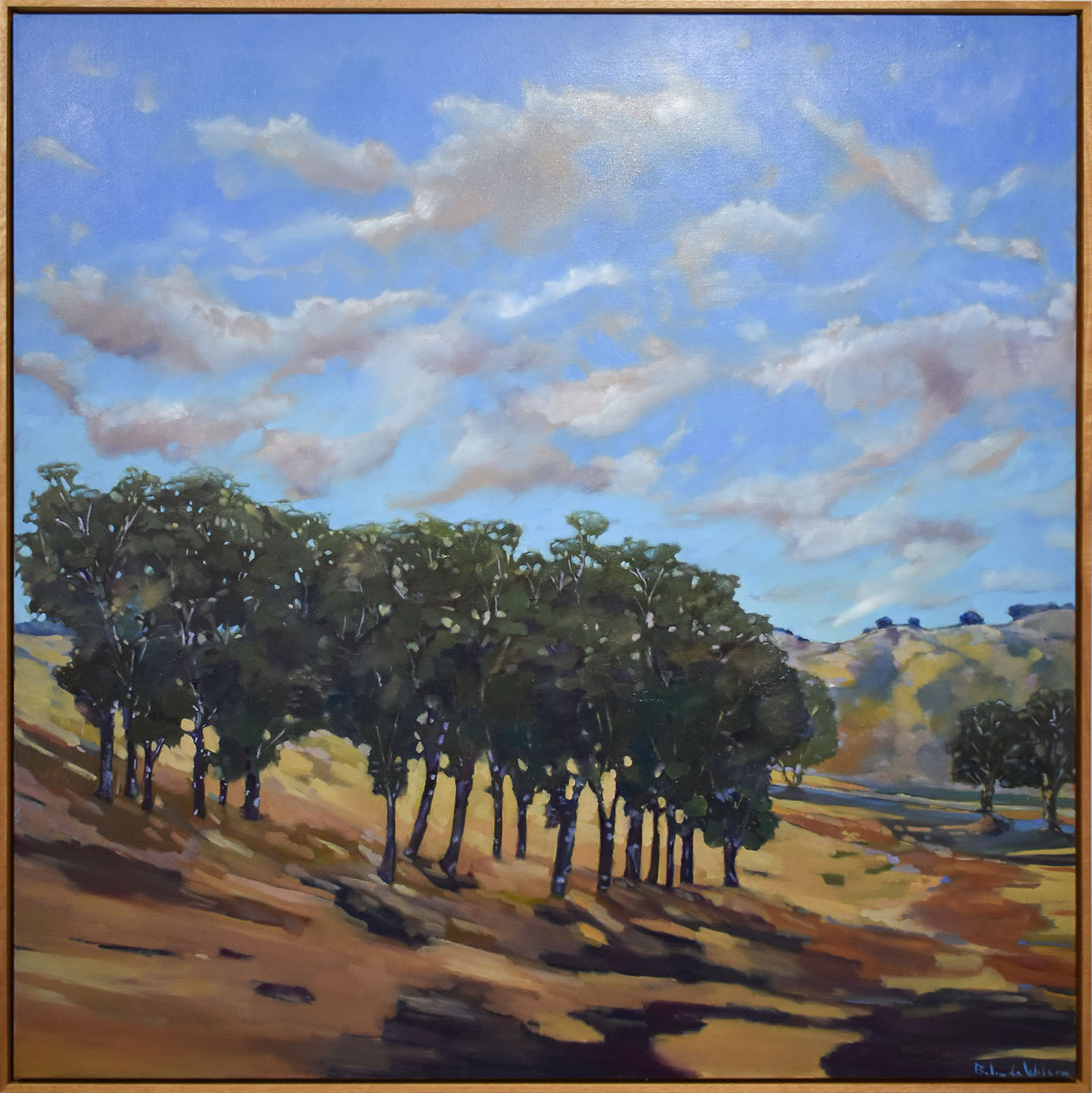 This painting focuses on the way light moves across the foothills of the Cathedral Ranges. The trees stand in strong contrast to the open slopes, creating patterns of shadow and brightness. The composition emphasises the changing light and the sense of space within the landscape, capturing a moment where the land feels both grounded and illuminated.